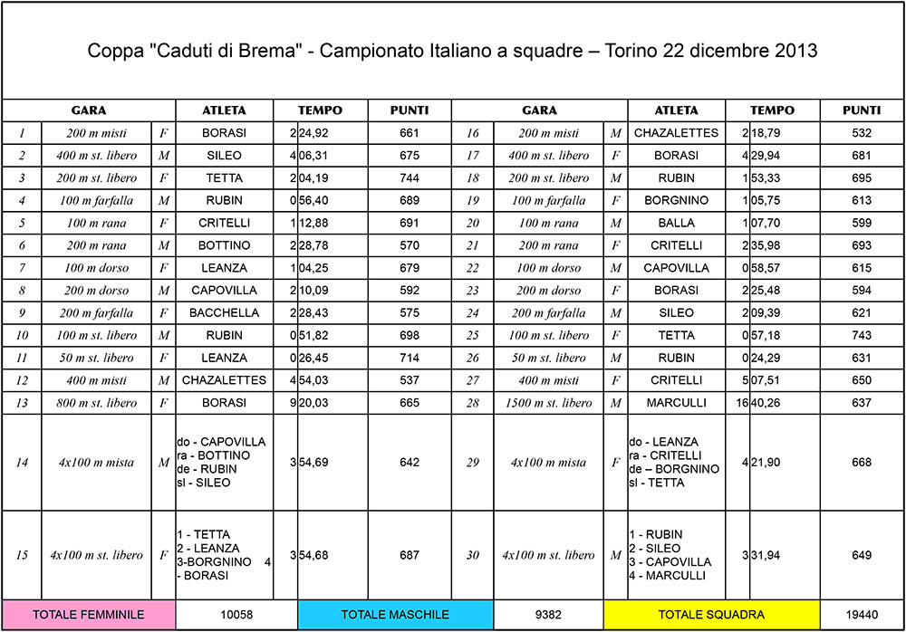 – LEANZA/BORASI/BORGNINO/TETTA 4x100sl 3.54.68