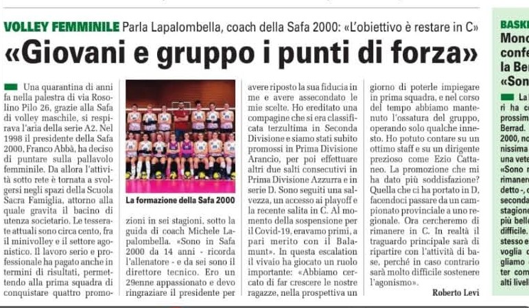 La prima squadra di Volley di SAFA 2000 non ha invece ancora avuto modo di riprendere gli allenamenti ma pensa al futuro ed alla nuova sfida che la attenderà in serie C, come dichiarato da Coach Lapalombella in una recente intervista. L’obiettivo della società sarà quello di far ripartire tutte le attività, che coinvolgono circa cento tesserate, dal mini volley alle squadre agonistiche.
